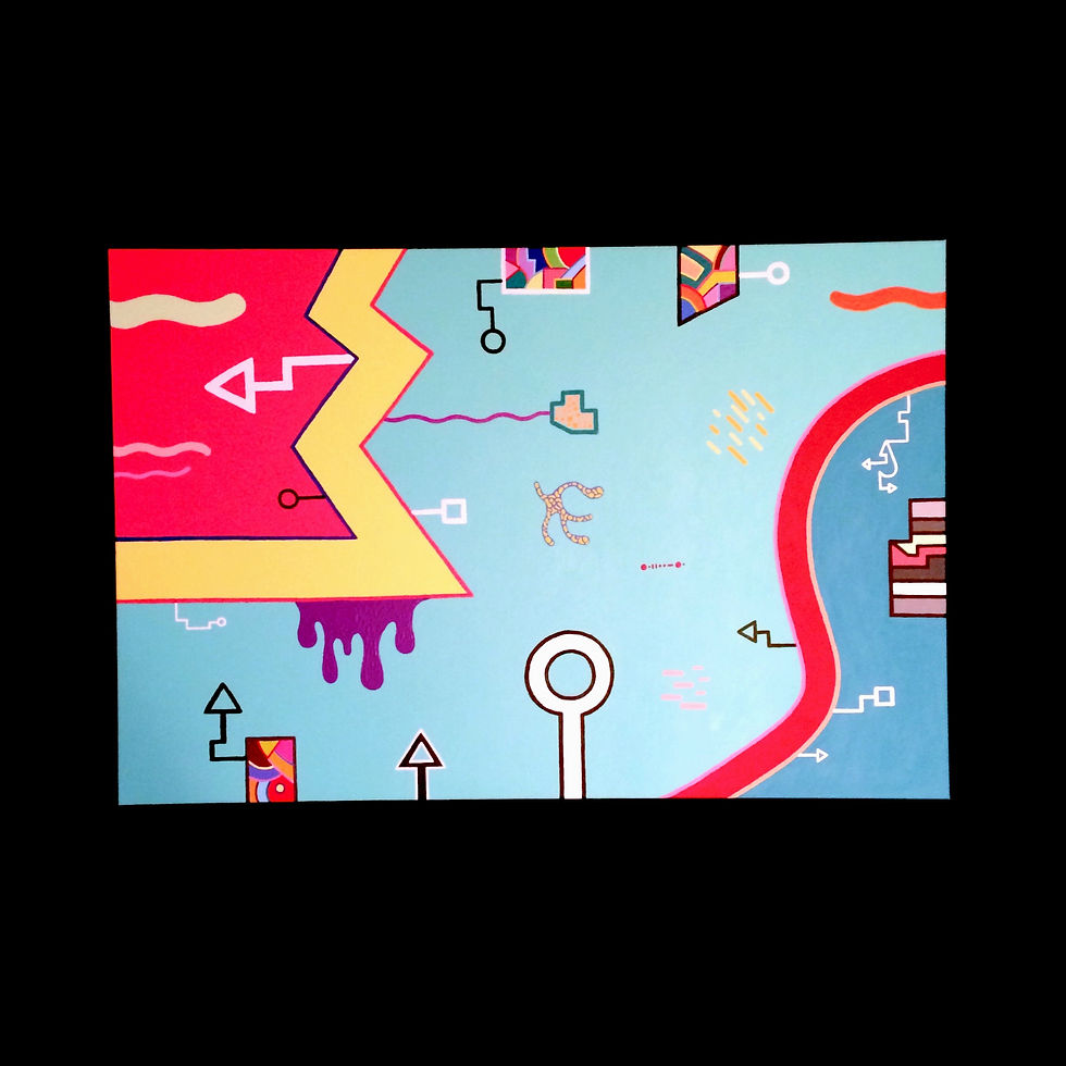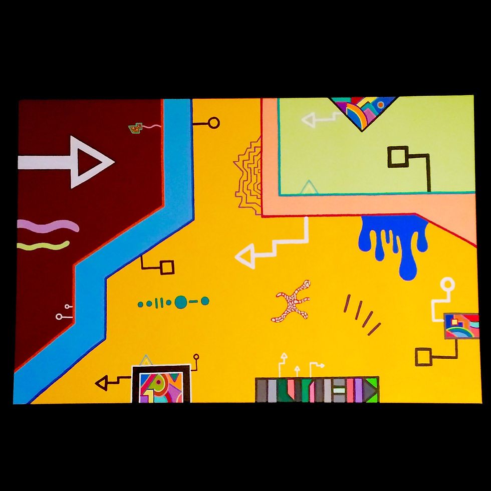 En 2016, j'ai commencé à créer de l'art dans un nouveau style non mandala. Ce style de mon art est inspiré par mon enfance dans les années 80. Les designs brillants et funky étaient populaires dans la mode et le design des années 80. Je trouve l'inspiration dans des choses comme les jeux vidéo à défilement latéral, les chemises Vuarnet, les montres Swatch et les fournitures scolaires Lisa Frank. J'essaye d'aborder chaque pièce comme si je créais un niveau pour un jeu vidéo. Chaque niveau est différent, mais aussi clairement du même jeu. J'espère que vous les creusez!